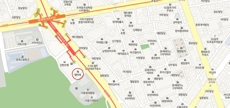 | 자가용 | 주차 가능 지방에서 오실 때 : 서초IC에서 양재역 방면으로 나오신 후 양재역사거리에서 성남방향으로 우회전합니다. 우회전 후 100m 직진하시면 우측에 엘타워가 있습니다. |